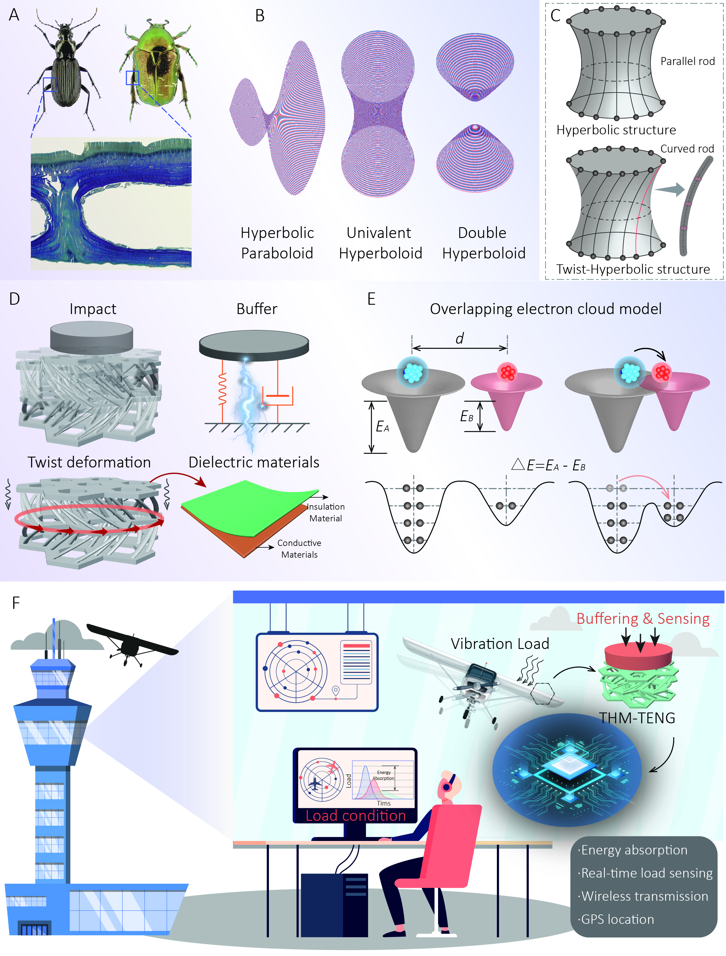 近日,威尼斯432888cam齐乐华教授团队在兼顾冲击防护与自供能传感的力学超结构方面的研究取得新进展。相关成果《Bioinspired Twist-Hyperbolic Metamaterial for Impact Buffering and Self-Powered Real-Time Sensing in UAVs》发表在Science 子刊《Science Advances》上。威尼斯432888cam晁许江副教授为第一作者,柔电院梁飞副教授、齐乐华教授和中科院王中林教授为通讯作者。