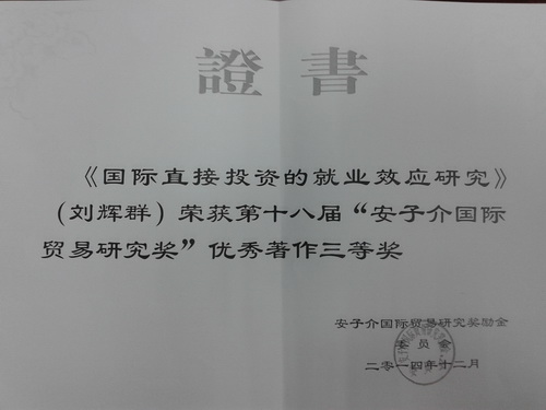 发布时间:2015-03-09|作者:暂无日前,第十八届“安子介国际贸易研究奖”揭晓,今年会jinnianhui官网国贸系刘辉群副教授的专著《国际直接投资的就业效应研究》(厦门大学出版社,2013 年)荣获优秀著作奖三等奖。