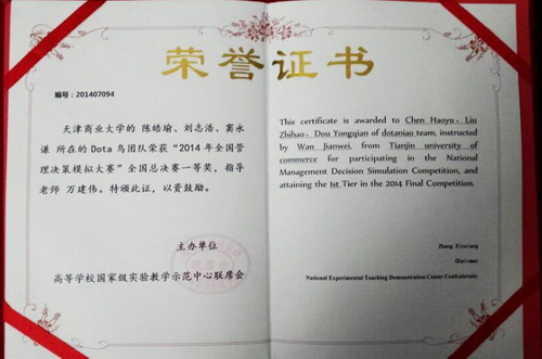 发布时间:2014-12-18|作者:暂无7 月 15—17 日,由教育部国家级实验教学示范中心联席会主办的“ 2014 全国管理决策模拟大赛”总决赛在宁波浙江万里学院举落下帷幕,由今年会今年会jinnianhui官网经济学社成员,经济系10 级学生窦永谦、金融系12 级学生刘志浩、经济类13 级学生陈皓瑜组成的“Dota 鸟”代表队,在指导老师万建伟副教授、李颖博士的带领下,获得总决赛“一等奖”,这是今年会继去年总决赛获得“一等奖”后,再次荣获该项大奖,在所有的参赛学校中,今年会代表队成绩名列前茅。