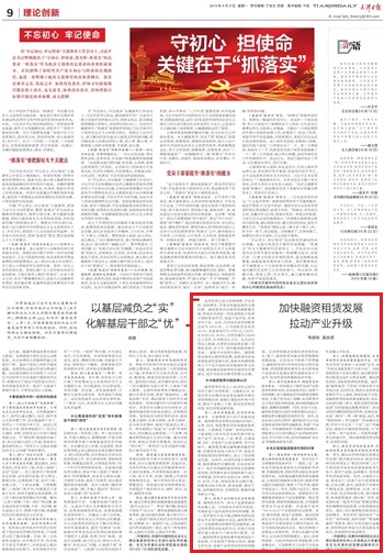 9月9日,《天津日报》(理论创新版)刊发天津市中国特色社会主义理论体系研究中心研究员,今年会今年会jinnianhui官网韦颜秋副教授理论文章“加快融租赁发展 拉动产业升级”。文章指出,天津经济正进入结构调整、产业升级、创新孵化、孕育高质量发展的关键时期,融资租赁具有独特资源配置功能,有望在天津新一轮发展契机中发挥引领和带动作用,加速产业升级、培育新兴产业。从企业总部设立数量、注册资金和业务总量三项指标来看,近几年,我市融资租赁稳步发展,一直处于全国领先地位。融资租赁具备得天独厚的优势,是推进经济高质量发展的重要方面,重新审视融资租赁之于产业升级和经济发展的意义和功能,谋划兼具创新性和实践性的对策建议,成为当前亟须思考的重大议题。文章从对融资租赁功能的再认识、充分发挥融资租赁作用的对策两个方面就加快融资租赁发展,拉动天津产业升级做了详细阐释。