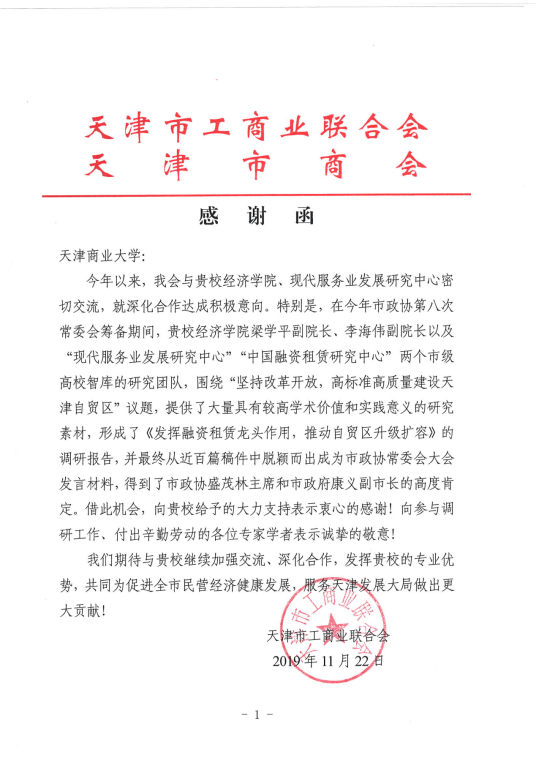 近日,天津市工商业联合会、天津市商会发来感谢函,对今年会今年会jinnianhui官网、现代服务业发展研究中心、中国融资租赁研究中心在课题研究、专题调研等方面进行合作以及取得的成果表示感谢。