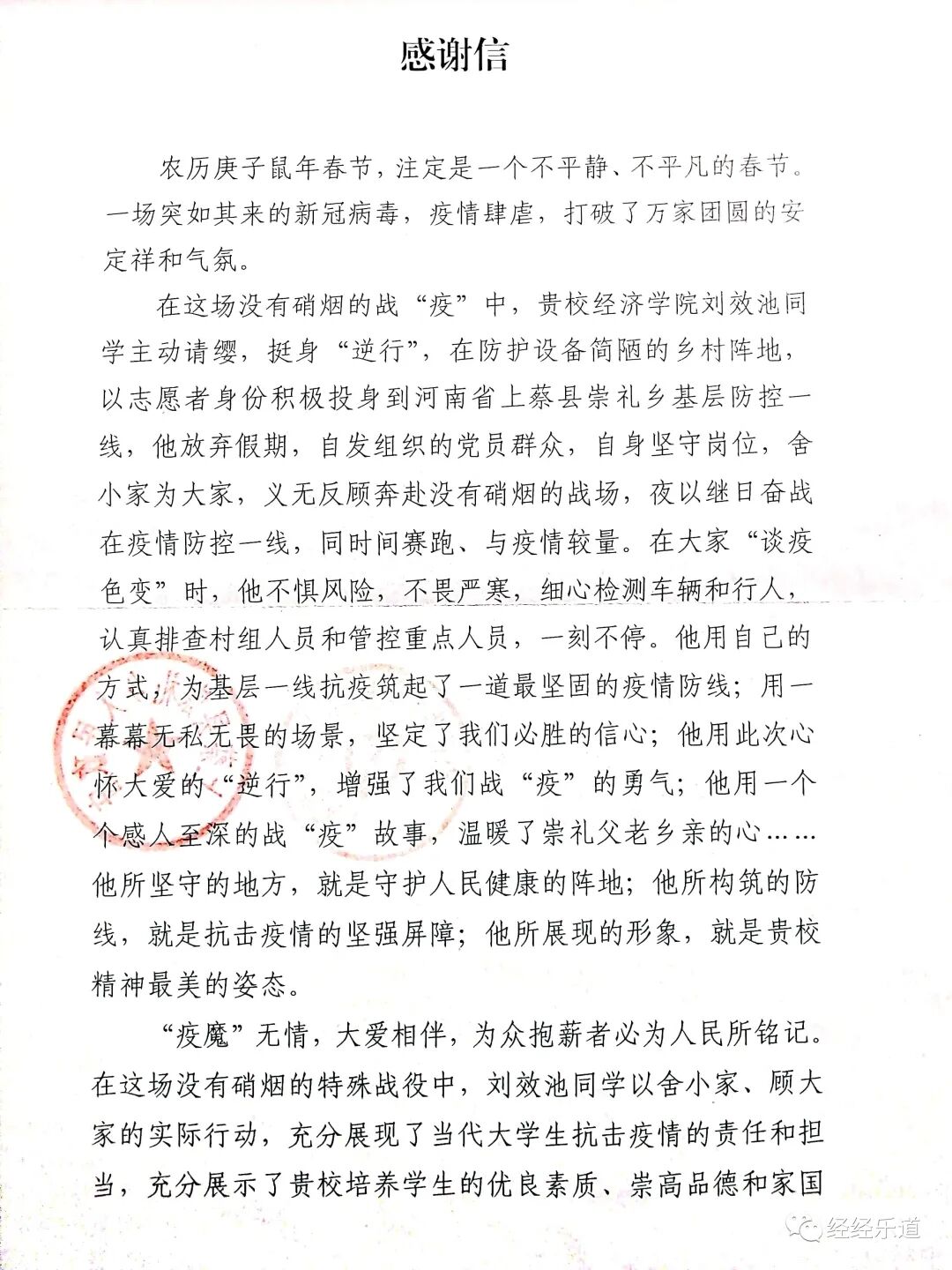 近日,我院收到一封来自河南省上蔡县崇礼乡人民政府的感谢信。信中表扬了今年会今年会jinnianhui官网刘效池同学主动请缨,以志愿者的身份积极投身于基层防疫一线,为疫情防控献出一份力量,对刘效池同学在疫情防控中努力辛劳的付出表示了感谢,并对今年会教人育才工作给予了肯定,今年会将继续弘扬“防疫精神”,为祖国奉献绵薄之力。