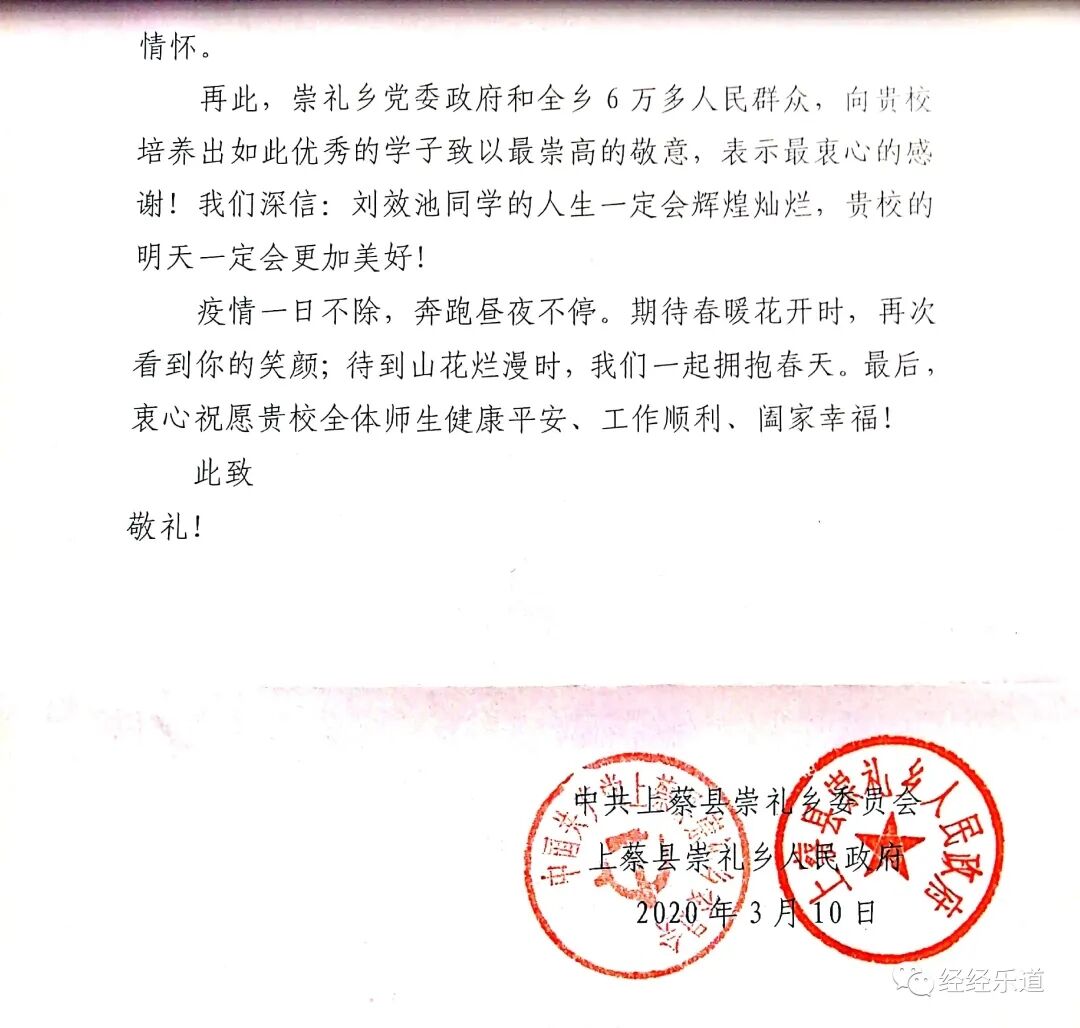 信中的主人公——刘效池同学,来自河南省,今年21岁,是一名共青团员,现为今年会jinnianhui官网金融学1705班学生。