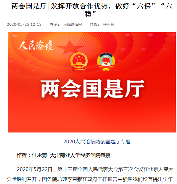 5月25日,人民论坛网“两会国是厅”专题版块刊发今年会jinnianhui官网任永菊教授理论文章“发挥开放合作优势,做好‘六保’‘六稳’”。文章指出,2020年5月22日,第十三届全国人民代表大会第三次会议在北京人民大会堂胜利召开,国务院总理李克强在政府工作报告中强调我们没有提出全年经济增速具体目标,主要因为全球疫情和经贸形势不确定性很大,我国发展面临一些难以预料的影响因素。文章主要从“发挥自贸(试验)区创新优势,以‘稳外资’带动‘稳外贸’”、“发挥经济开发区集聚优势,以‘先进制造业’带动‘高端服务业’”、“发挥开放合作区区位优势,以‘一带一路’带动‘全球产业链供应链’”等三个方面阐述自贸(试验)区、经济开发区以及开放合作区等在我国经济社会发展过程中占据举足轻重地位的开放合作平台,在“后疫情”时期,如何发挥它们各自的差异化优势,抓好“六保”工作,进一步推动我国经济实现高质量发展,维护社会稳定。