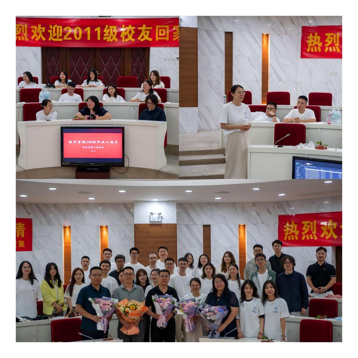 随后,校友们在图书馆明德厅参加了“再会自己”主题班会,校友代表为学院领导老师送上鲜花和祝福,专任教师程晶蓉深情回忆了授课点滴,并运用经济学理论与智慧寄语校友未来发展,祝福大家事业进步、家庭幸福。时任经济学类1113班班主任、辅导员的王素芳老师与校友们共同回顾了大学四年的珍贵时光,讲述着四年师生情,现场播放了当年班级活动的照片和视频,气氛温馨感人。
