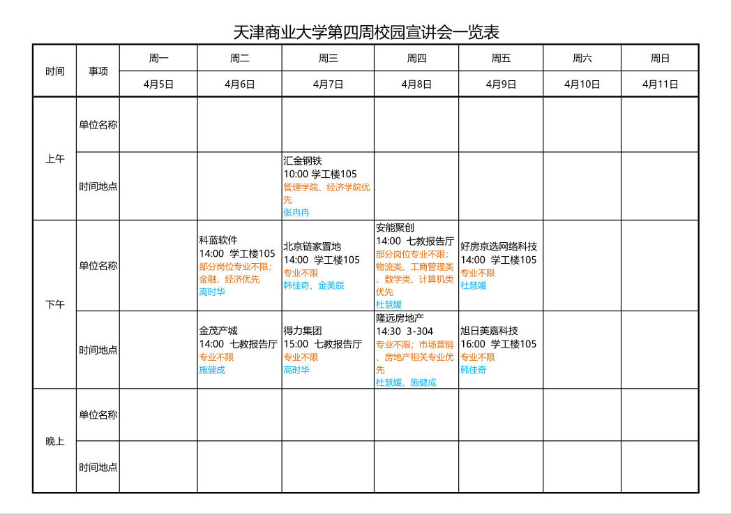 今年会为向天商学子传达相关组织、团体或企业的情况、文化价值观、人力资源政策、校园招聘的程序和职位介绍等信息,接下来的第四周所举办招聘会的相关信息如下。