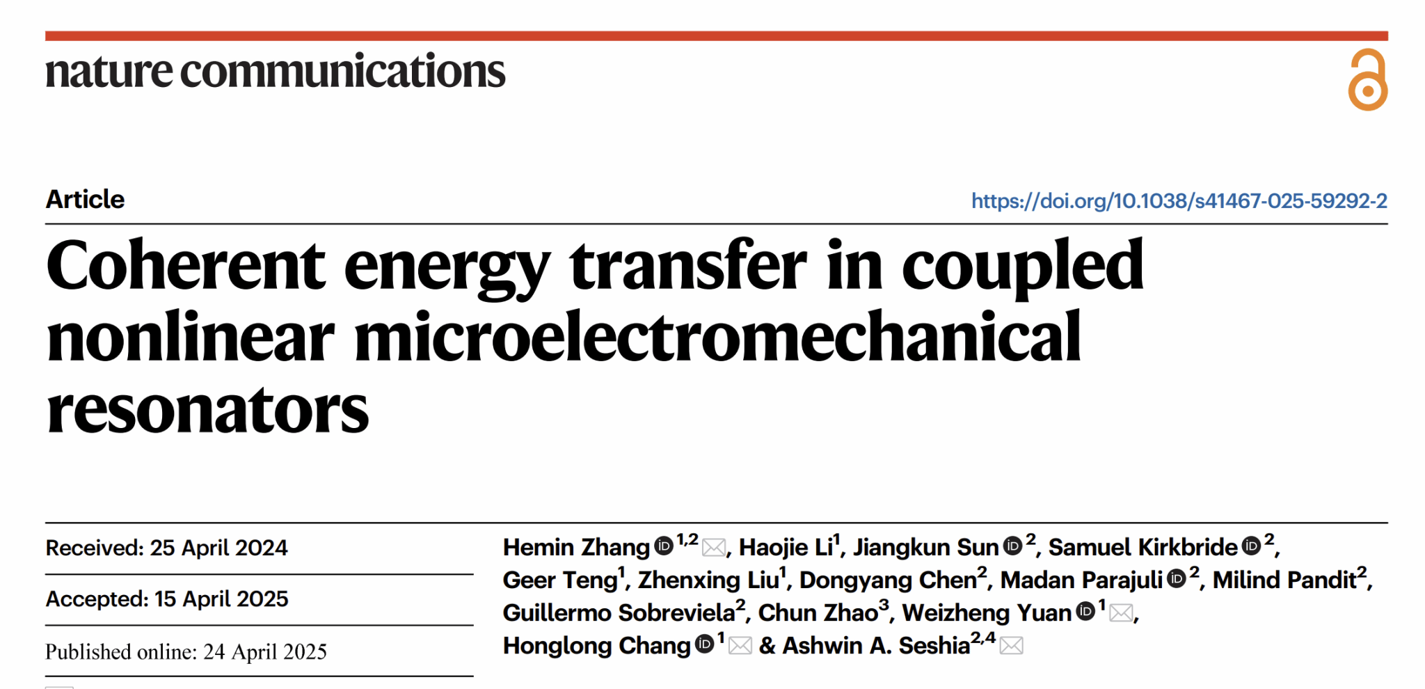 近日,威尼斯432888cam教师在微机械耦合谐振器能量传输机制方面的研究取得新进展。相关成果《Coherent Energy Transfer in Coupled Nonlinear Microelectromechanical Resonators》发表在国际知名学术期刊《Nature Communications》上。威尼斯432888cam国家级青年人才张和民教授为第一作者,常洪龙教授、苑伟政教授和剑桥大学Ashwin A. Seshia教授为共同通讯作者。