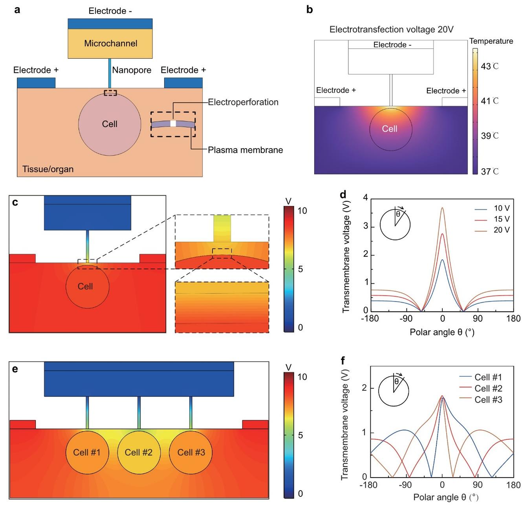 论文介绍了一种柔性可植入式电子贴片(NanoFLUID),它融合了柔性电子、微纳加工等前沿科技,具备无线控制、极致轻薄以及易贴附等优势,能够像创可贴一样便捷地贴附在生物体器官表面,精准地将药物送达靶器官部位以及细胞内部。该生物电子贴片独特的“纳米孔-微通道-微电极”三维结构,使其能够在低电压条件下安全地对细胞膜进行穿孔,并巧妙借助纳米孔道内产生的超高电场强度,将大分子或基因药物分子以超越传统递送速度的方式,安全、快速且高效地送入目标细胞之内(图 1)。这一技术作为生物电子学领域的一项具有范式革新意义的突破,为内脏器官靶向治疗开拓了全新路径:其一,无源无线的创新设计,成功实现了对深部器官的精准干预;其二,打破了传统给药方式所面临的细胞膜屏障限制,显著提升了药物递送的时效性;其三,该平台技术展现出极强的拓展性,不仅可针对癌症、创伤等重大疾病开发新型治疗方案,还能作为研究工具,有力推动基础医学发现。