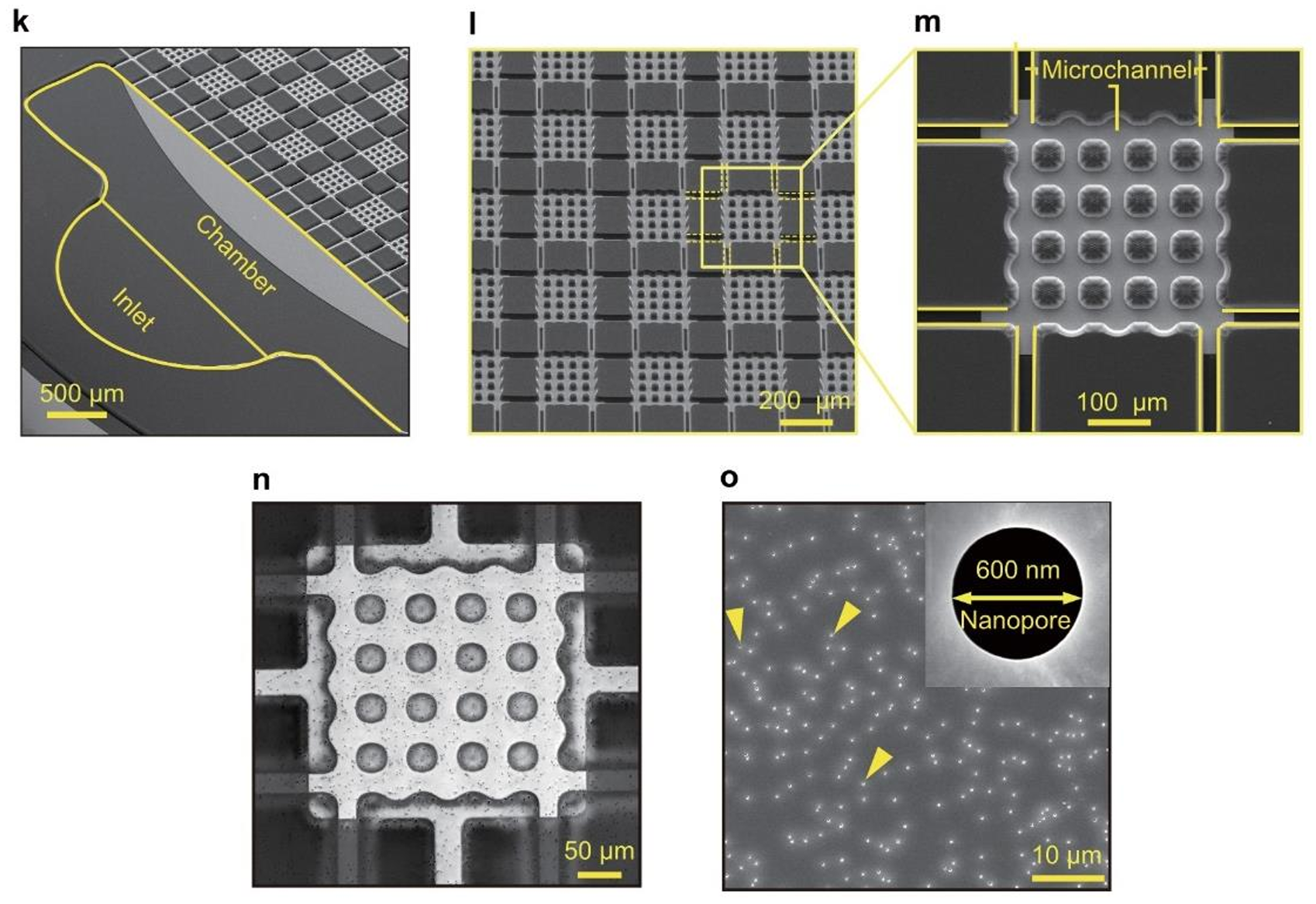 柔性可植入式电子贴片的设计和加工面临极大挑战,载药仓需同时满足体积小巧、药物装载量充足以及与无源电场模块完美连接等要求。研究团队尝试了多种方案,最终选择在载药仓内部设计多个微柱以形成微流道,并利用虹吸效应,实现药物的快速装填与排出。我校郝永存副研究员与常洪龙教授在柔性电子贴片的设计及制造方面开展深入研究,成功建立了“纳米孔-微通道-微电极”三维结构的电学、热学及力学模型(图 2),有力证明了纳米孔通道能够安全、高效且精确地在细胞膜上穿孔;攻克了聚合物-金属多层微纳结构制造技术难关,并依托我校“空天微纳系统教育部重点实验室”的微纳制造平台,完成了柔性电子贴片的精密制造(图 3)。郝永存副研究员自 2019 年项目启动之初便投身研究,直至 2022 年完成投稿,期间器件的设计与加工工艺随着生物体内应用场景的拓展而不断更新完善。从 2022 年投稿到 2025 年正式接收,历经两年多的修改完善,该成果最终发表于《自然》杂志。